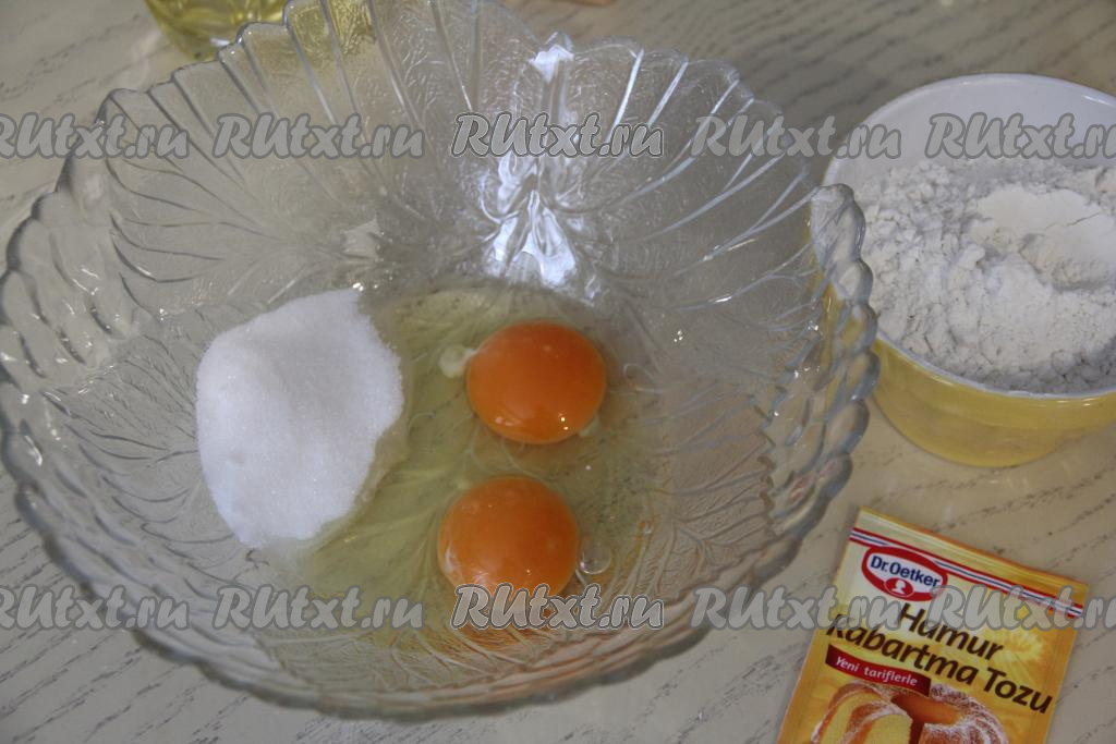 В миску вбить яйца, всыпать сахар.