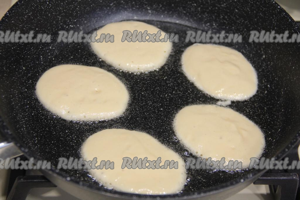 Очень хорошо прогреть сковороду, смазанную растительным маслом, затем выкладывать по 1 столовой ложке теста в виде круглых оладий.
