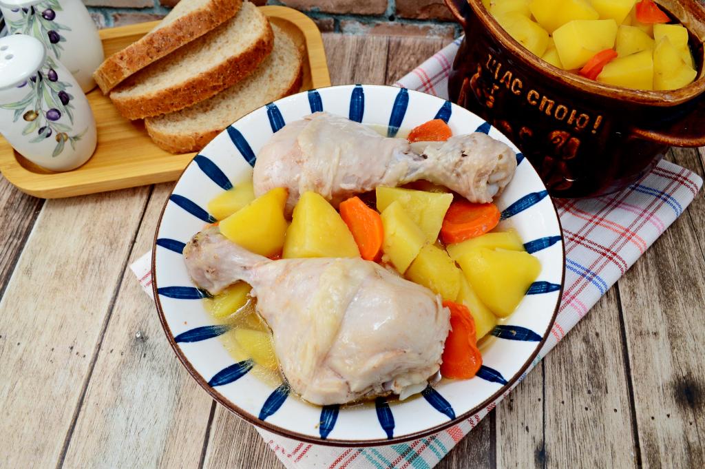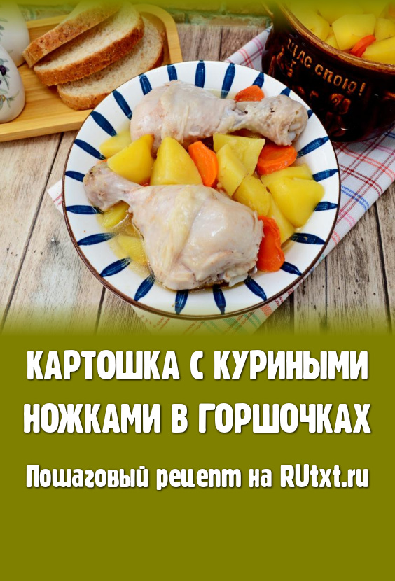 Картошку и куриные ножки переложить из горшочков по тарелкам и в горячем виде подать к столу. Вода, которая добавлялась в горшочки, превращается в аппетитнейший бульон, его тоже не забываем разлить по тарелкам. Готовится это блюдо в духовке достаточно просто, а всегда получается вкусным и аппетитным, советую попробовать!