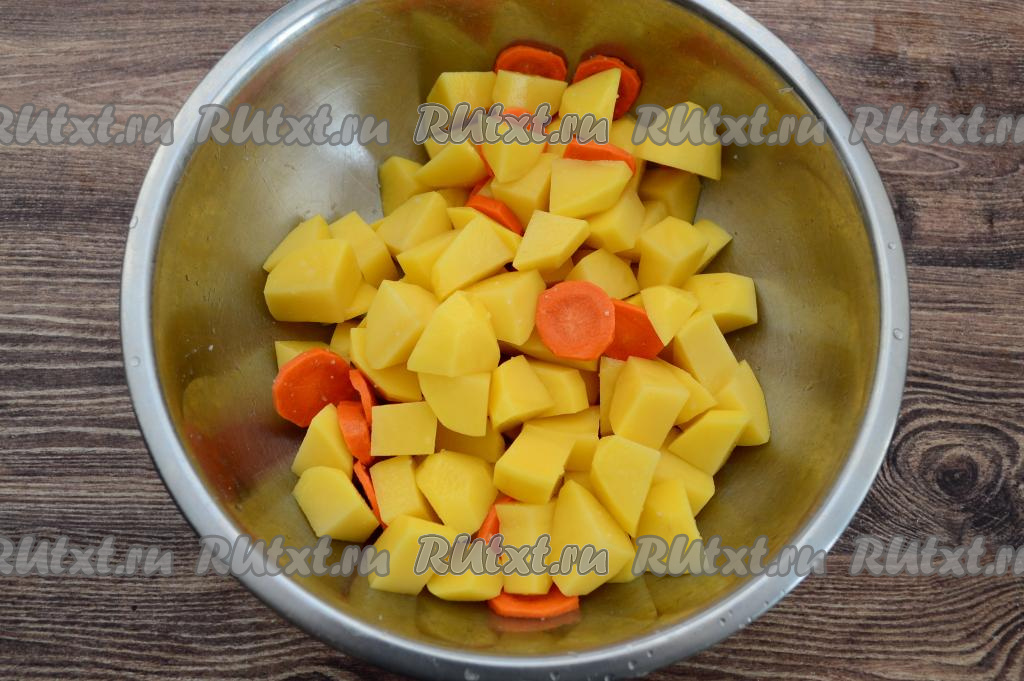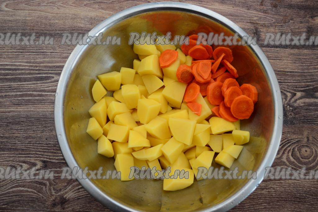 Морковку очистить, промыть, нарезать на кружочки, добавить в миску с картошкой.