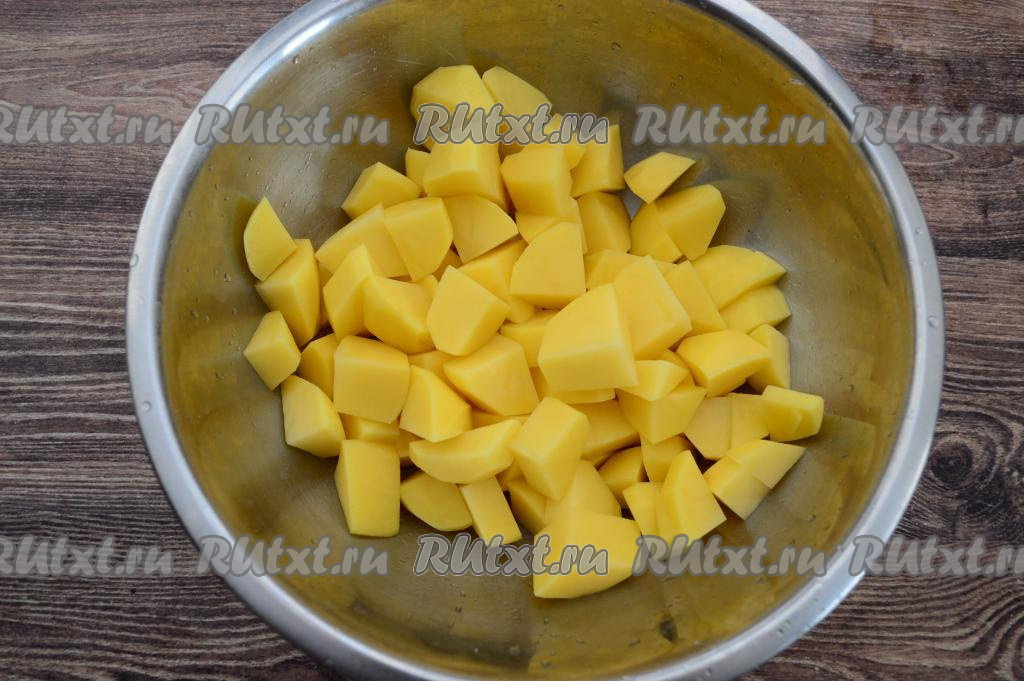 Картошку очистить, промыть, нарезать на достаточно крупные кубики. Сложить нарезанную картошку в глубокую миску.