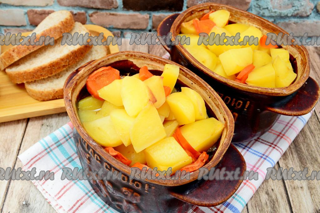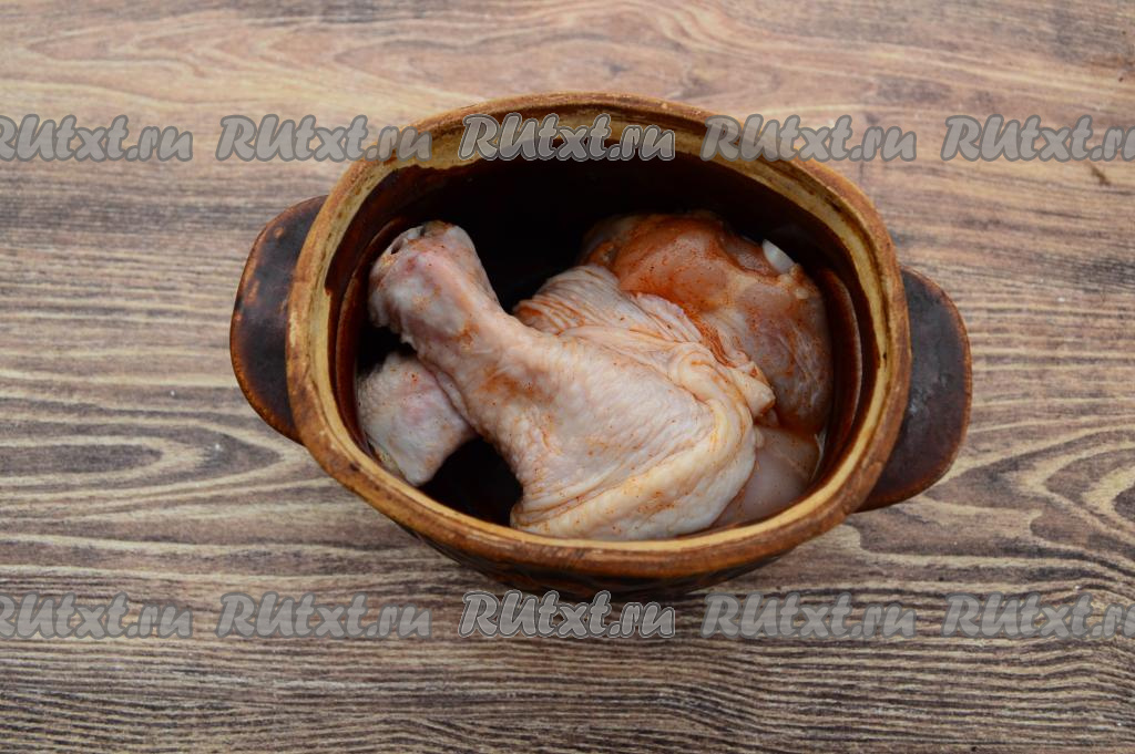 Картошку с морковкой разложить по горшочкам поверх куриных ножек. В каждый горшочек влить примерно 100 миллилитров горячей воды (я обычно заливаю горшочки водой примерно на 3/4 объёма).
