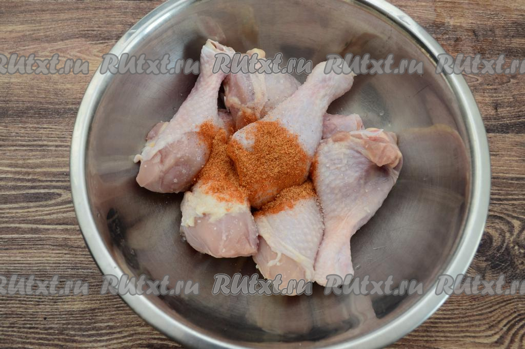 Куриные ножки выложить в миску, посолить по вкусу, добавить специи (я всыпала 0,5 чайной ложки специй для курицы и индейки), тщательно перемешать, покрывая мясо специями со всех сторон.