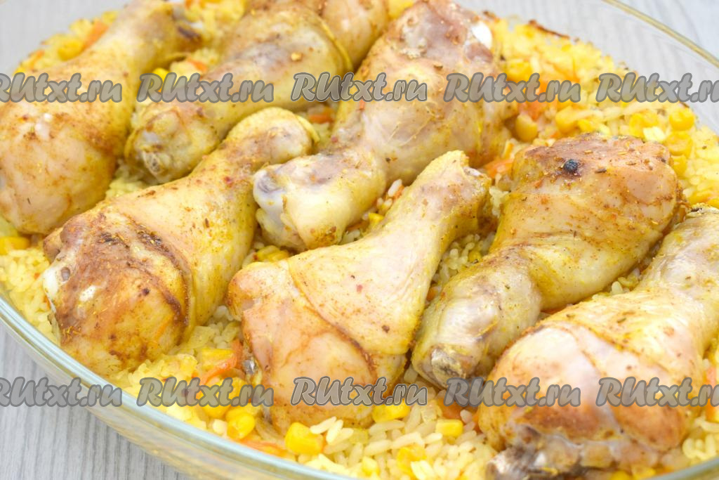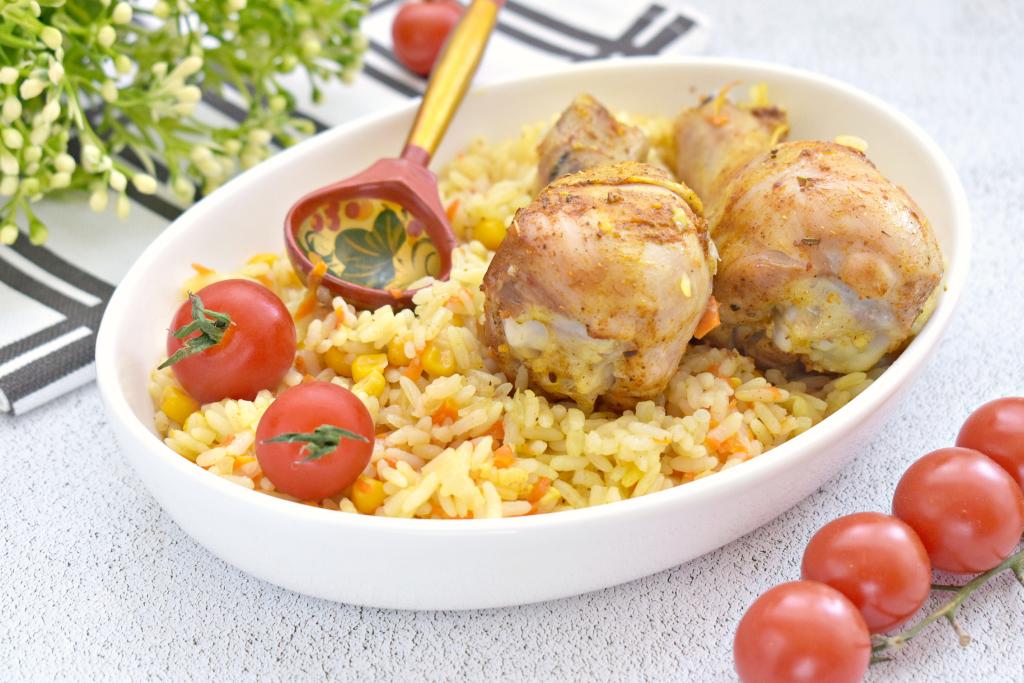 Достаём готовое блюдо из духовки. Хорошо пропаренный рис с сочными куриными ножками и аппетитной кукурузой раскладываем по тарелкам и сразу подаём к столу. Сытно и вкусно, попробуйте!