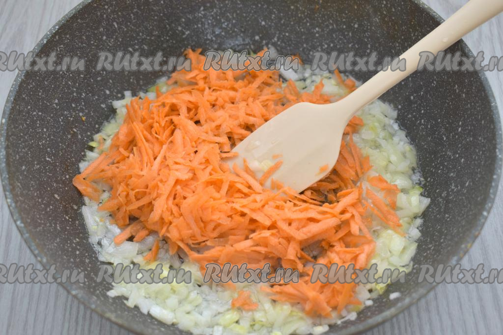 К луку выкладываем морковку, натёртую на крупной тёрке, сразу перемешиваем овощи и обжариваем их минут 5-6 (до мягкости моркови), иногда помешивая.