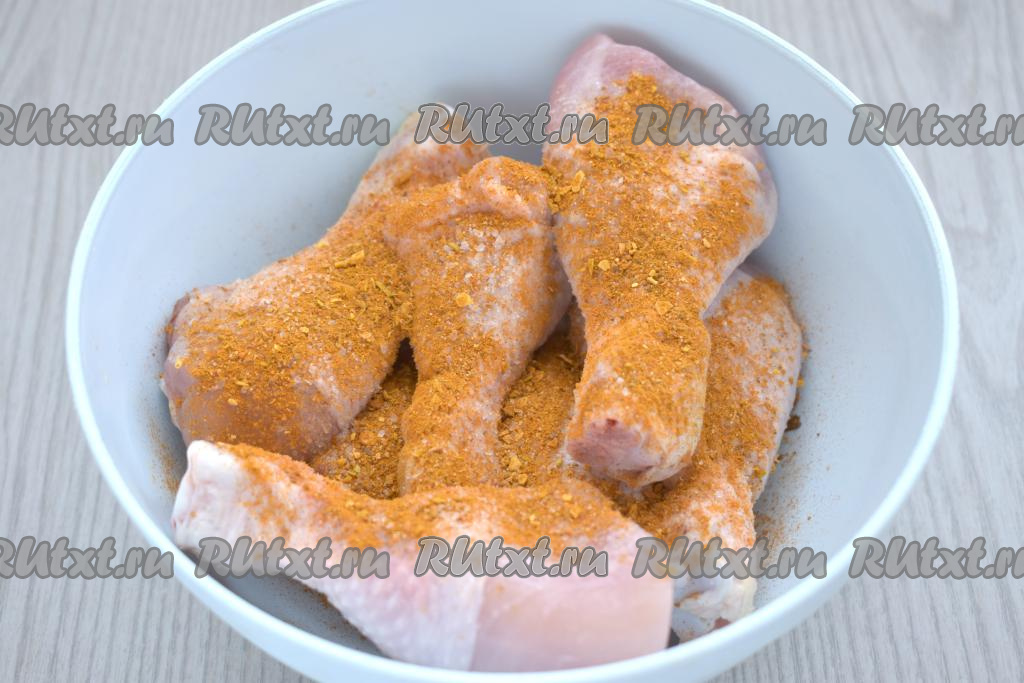 Моем куриные ножки, обсушиваем их, выкладываем в миску. Солим ножки, посыпаем любимыми специями (я в качестве специй добавила 1,5 чайных ложки приправы для курицы), хорошо перемешиваем и оставляем на время, пока будем заниматься рисом с овощами.