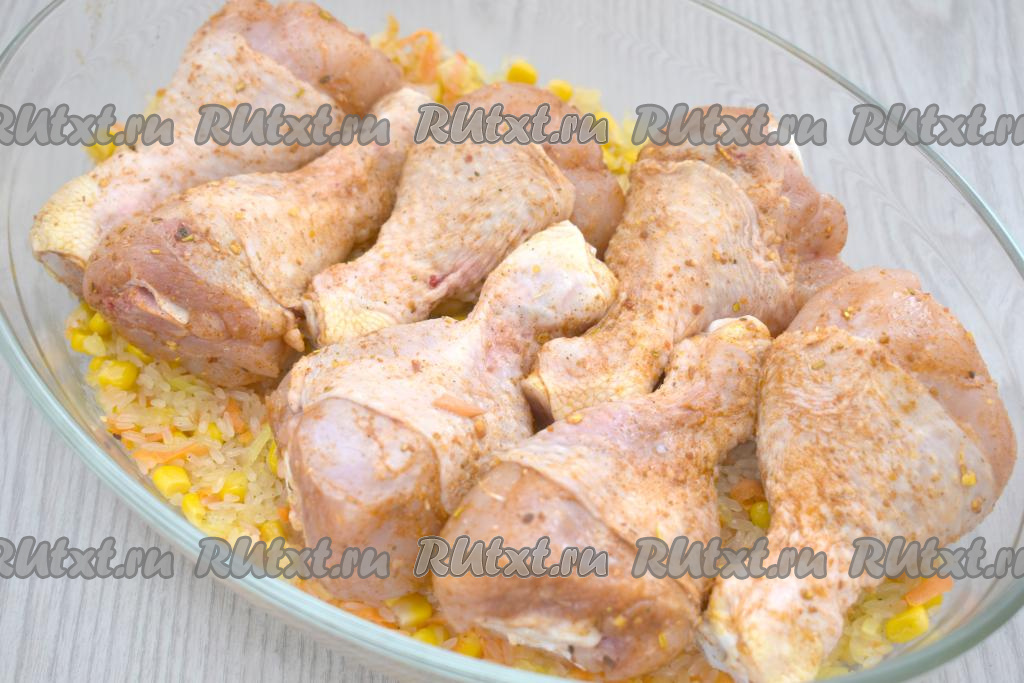 Сверху выкладываем куриные ножки, замаринованные в специях.