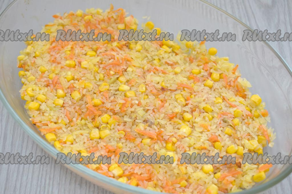 Рис с овощами и кукурузой перекладываем в жаропрочную форму, разравниваем.