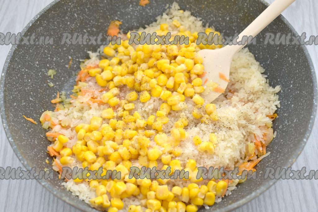 Сюда же сразу выкладываем консервированную кукурузу без жидкости, немного солим, можно приправить специями (я посыпала чёрным молотым перцем), перемешиваем и прогреваем на сковороде в течение 1-2 минут, иногда помешивая.