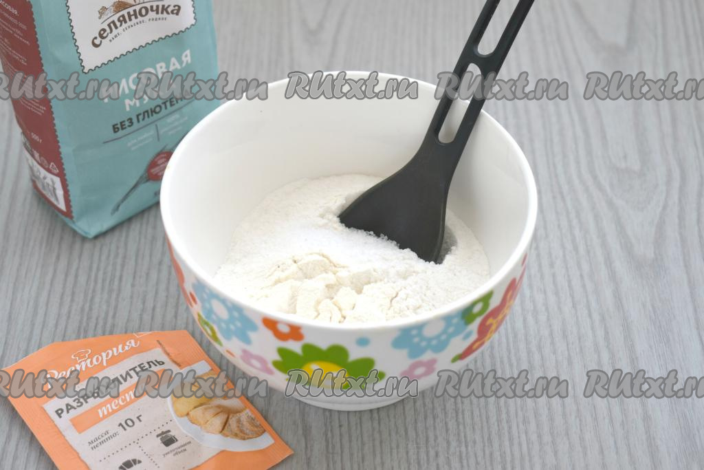В небольшую миску просеиваем рисовую муку, добавляем разрыхлитель и соль, перемешиваем до однородности.