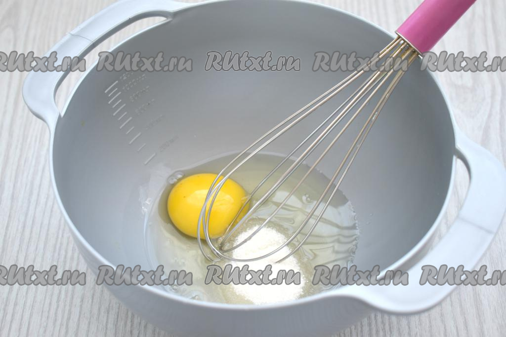 В отдельную глубокую миску разбиваем яйцо, добавляем к нему сахар, взбиваем венчиком до однородности.
