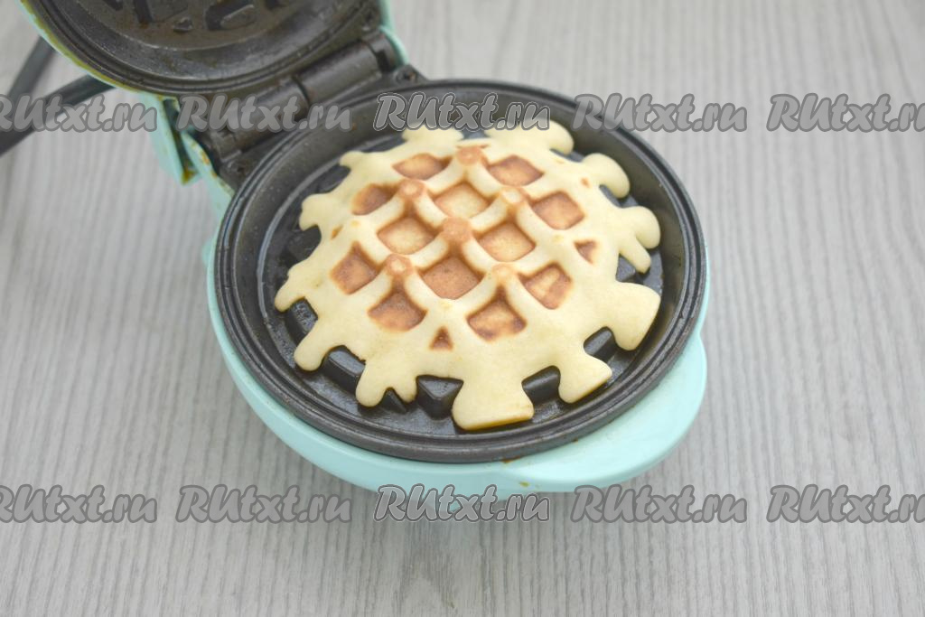 Выпекаем вафлю до лёгкого подрумянивания (ориентировочно минут 5-6). Длительность выпекания зависит от мощности вашей электровафельницы. Готовую вафлю перекладываем на решётку, даём остыть. Периодически перемешивая тесто, постепенно выпекаем все вафли.