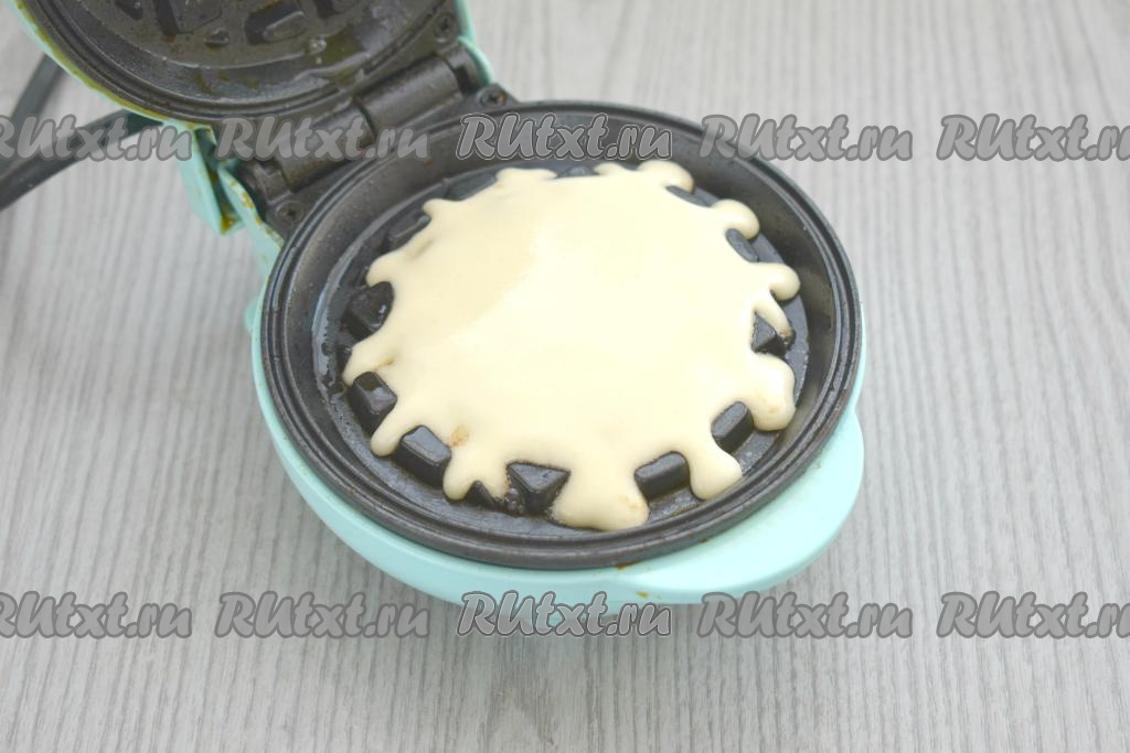Панели электровафельницы смазываем растительным (или сливочным) маслом. Когда панели достаточно разогреются, выкладываем в центр нижней панели примерно 2 столовых ложки теста.