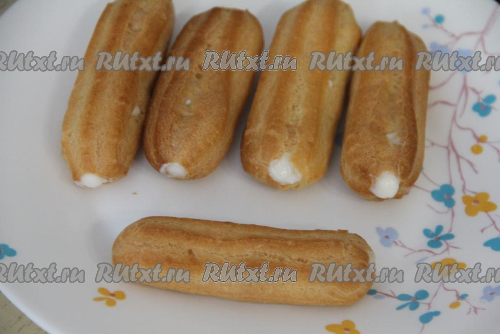 Если нет кулинарного мешка с такой насадкой, тогда можно сделать острым ножом на эклере сбоку надрез и наполнить его кремом.