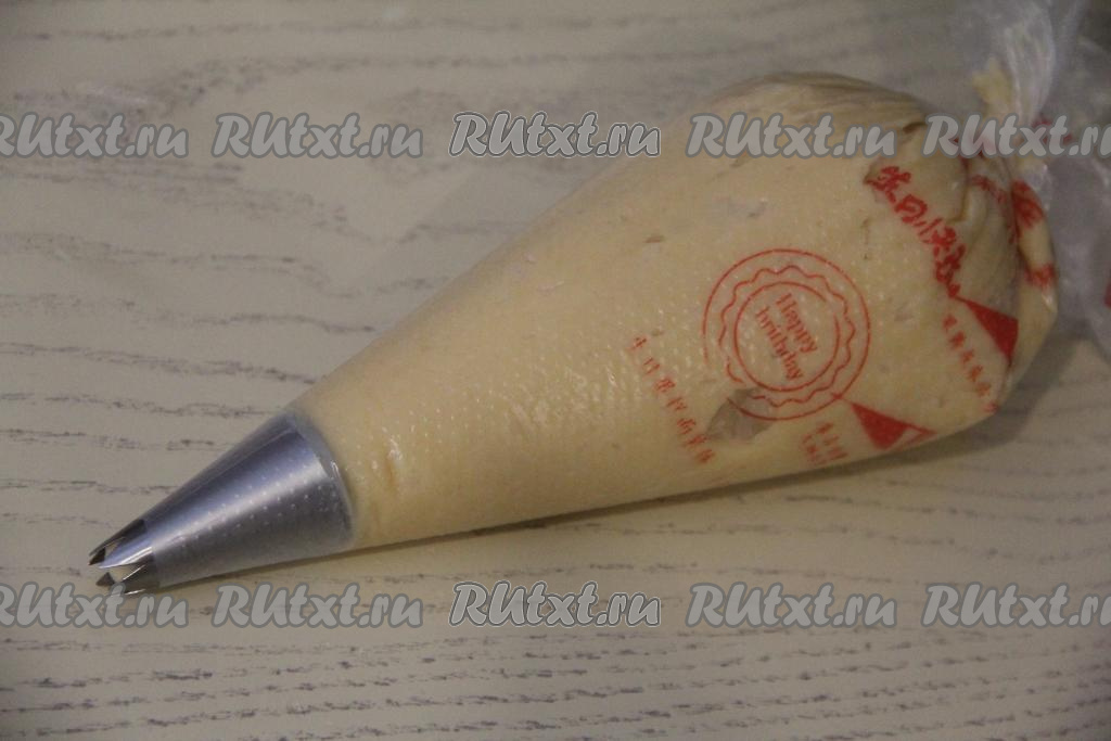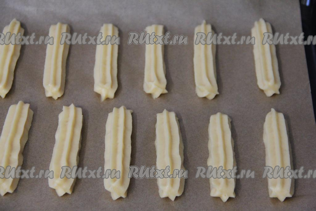 Противень застелить пергаментом. Отсадить эклеры на противень на небольшом расстоянии друг от друга.