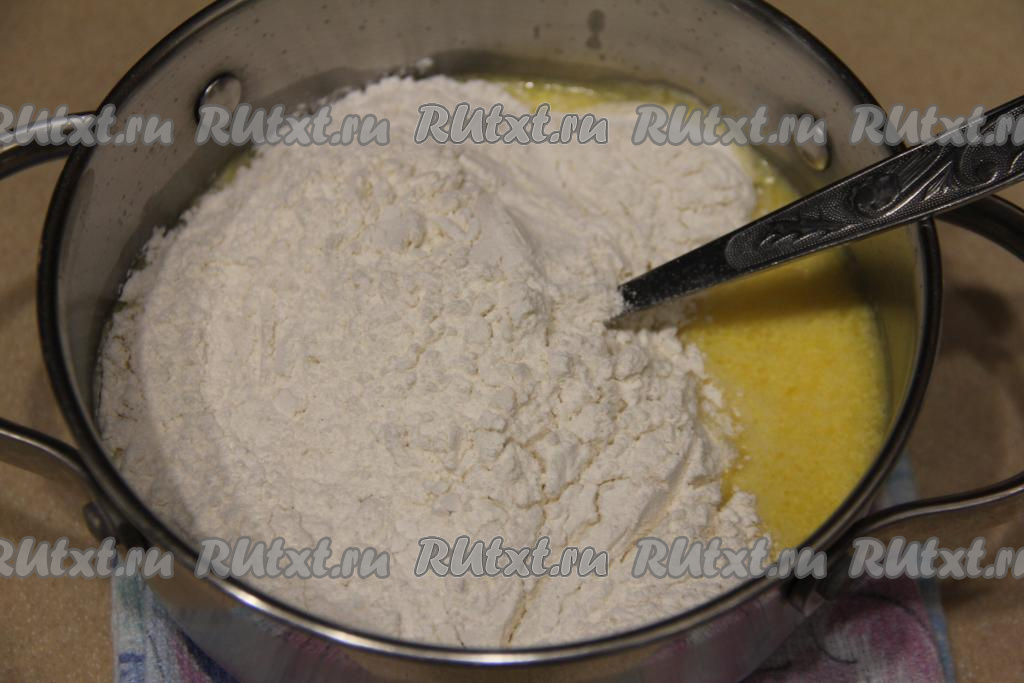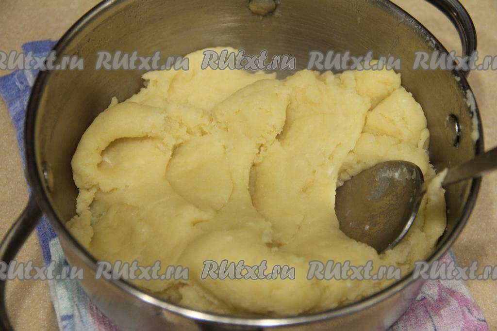 Сразу тщательно и быстро перемешать заварную массу столовой ложкой (или лопаткой). Масса должна стать пластичной и однородной, снять с огня.