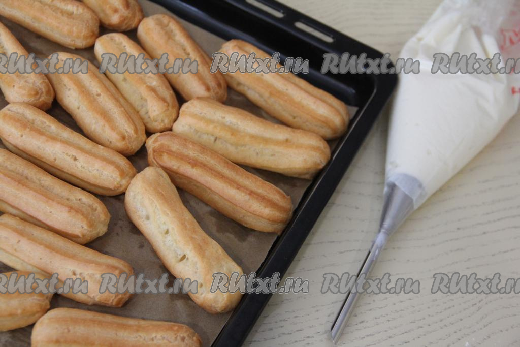 Выпекать эклеры в духовке, разогретой до 220 градусов, в течение 15 минут, затем убавить температуру до 200 градусов и, не открывая дверцу духовки, выпекать ещё минут 15. Готовые эклеры должны увеличиться в объёме и стать приятного золотистого цвета. Готовые эклеры достать из духовки полностью остудить. Постепенно испечь все эклеры.