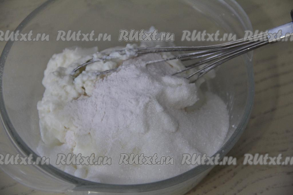 Для приготовления крема для эклеров нужно соединить в миске рикотту с сахаром и ванильным сахаром, перемешать венчиком и оставить минут на 10 (до полного растворения сахара).