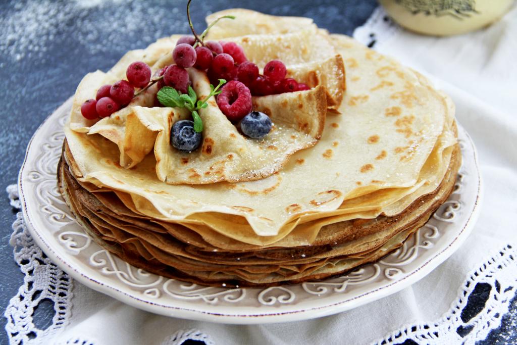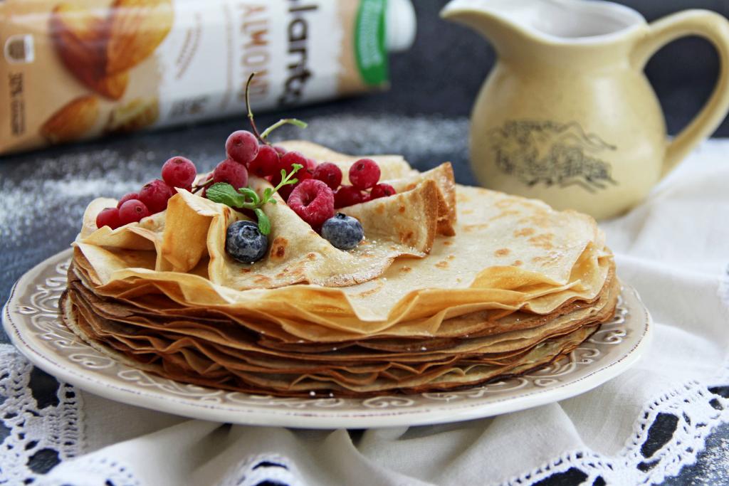 Вкусные, нежные, ароматные блины, приготовленные на миндальном молоке, подать к столу с мёдом, сметаной или вареньем.