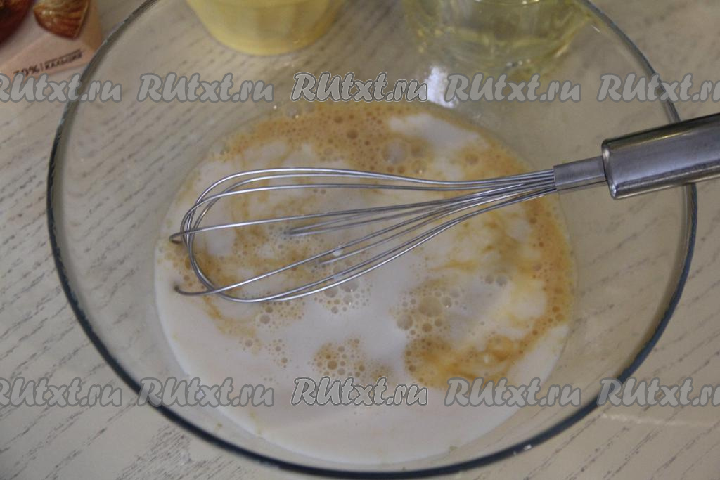 В миску с яичной смесью влить миндальное молоко, добавить соль, перемешать венчиком до однородности.