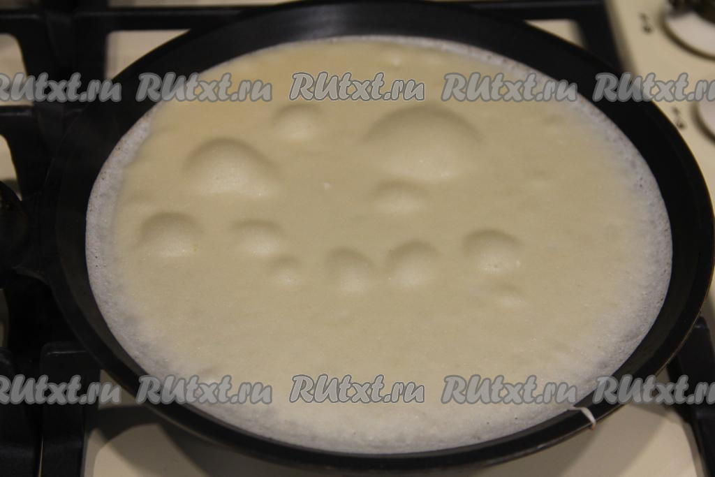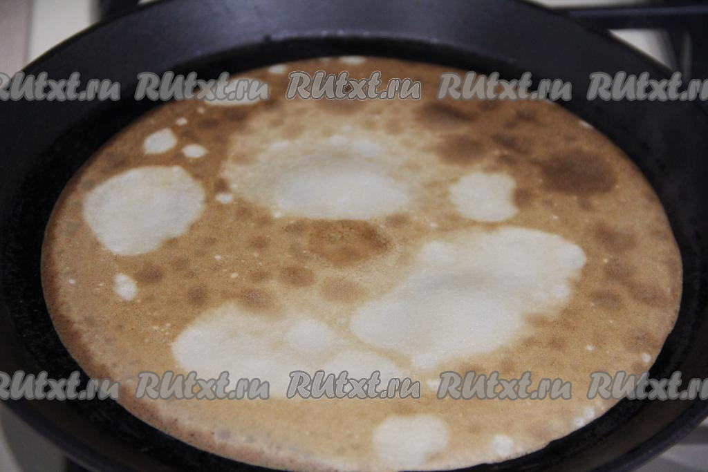 Сковороду, смазанную растительным маслом, хорошо разогреть. Влить половник теста в сковородку. Сразу равномерно распределить тесто по дну сковородки. Выпекать тонкий блинчик на среднем огне до подрумянивания снизу.