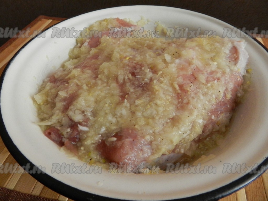 Кусок мяса вымыть, обсушить бумажными полотенцами. Натереть свинину со всех сторон луковым маринадом и оставить на 2-3 часа мариноваться.
