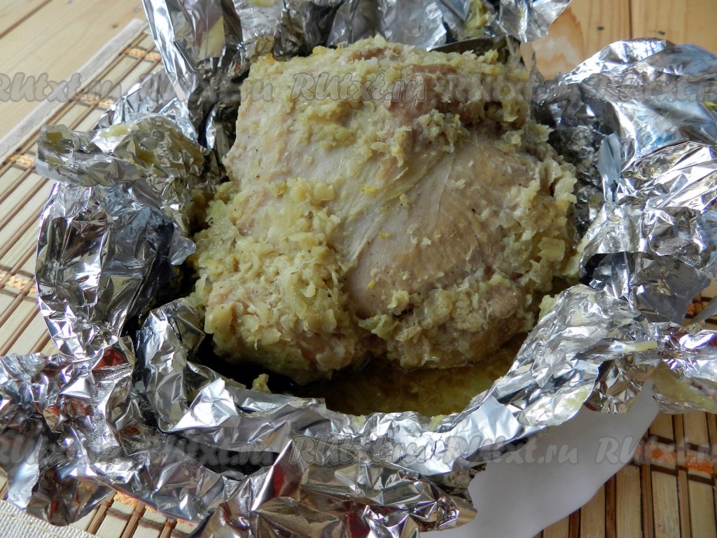 Запекать свинину в луке в разогретой духовке 1 час. Если хотите получить на поверхности мяса корочку, за 15 минут до готовности раскройте фольгу и запекайте мясо, поливая выделившимся соком.