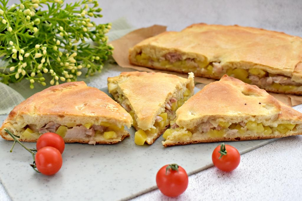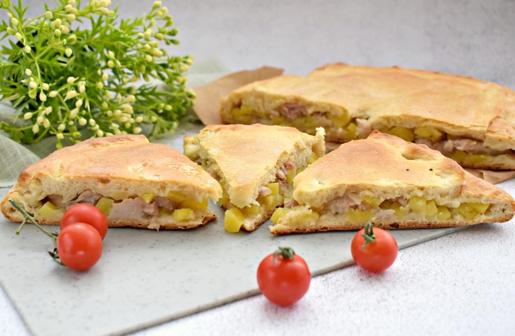 Поднявшееся дрожжевое тесто обминаем и делим на два куска. Один кусок теста должен быть больше другого почти в 2 раза. Большую часть теста на слегка присыпанной мукой поверхности раскатываем в квадратный пласт со стороной примерно 28 сантиметров. Помещаем раскатанное тесто на противень, предварительно застеленный пергаментом. На тесто равномерно выкладываем начинку из картошки и курицы, отступая от краёв теста по 2 сантиметра.