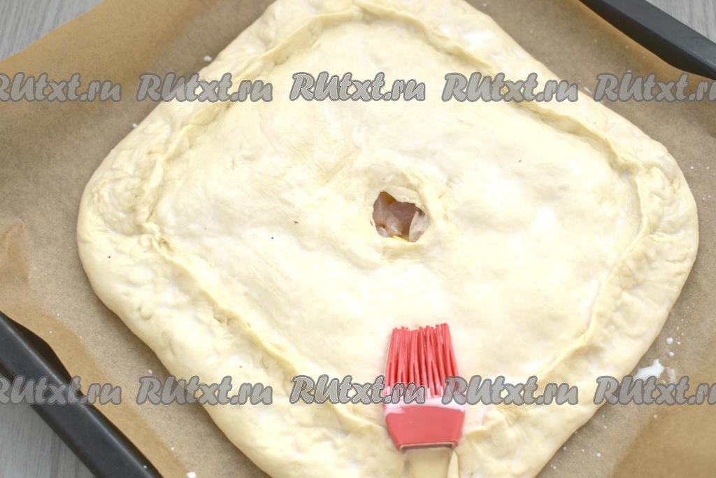 Вторую часть теста тоже раскатываем, накрываем ею начинку, скрепляем края пирога, заворачивая нижний пласт теста над начинкой. В центре делаем отверстие для выхода пара. Поверхность курника смазываем молоком.