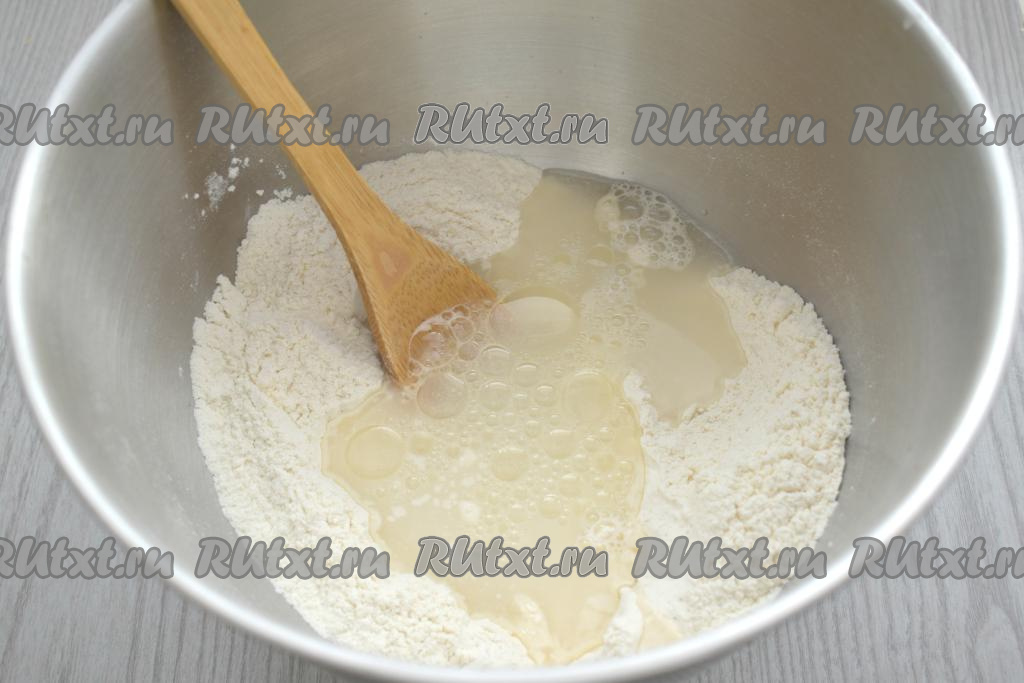 В центр смеси из муки и дрожжей вливаем тёплую воду (примерная температура воды 38 градусов) и растительное масло. Перемешиваем тесто вначале лопаткой, а затем вымешиваем его руками не менее 7 минут.