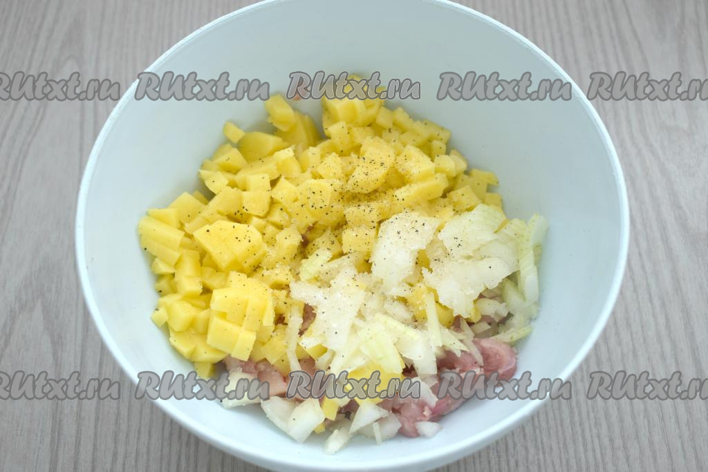 Репчатый лук очищаем, нарезаем мелко, перекладываем в миску с куриным мясом. Очищенный картофель нарезаем на очень маленькие кубики, тоже добавляем в миску. По вкусу солим и перчим.