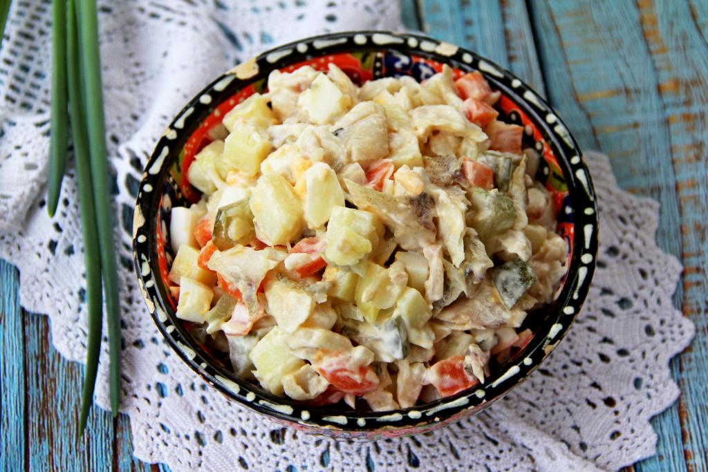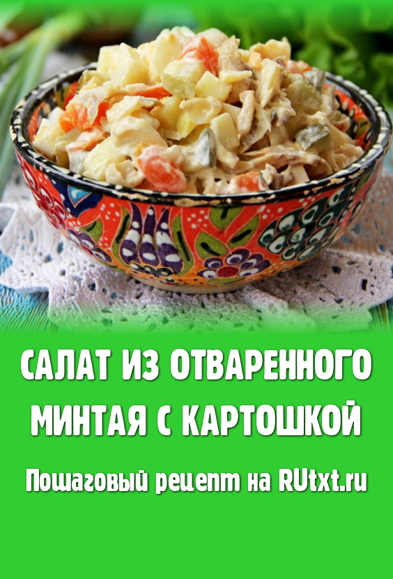 Нежный, вкусный салат, приготовленный из отваренного минтая с картошкой, подать к столу.