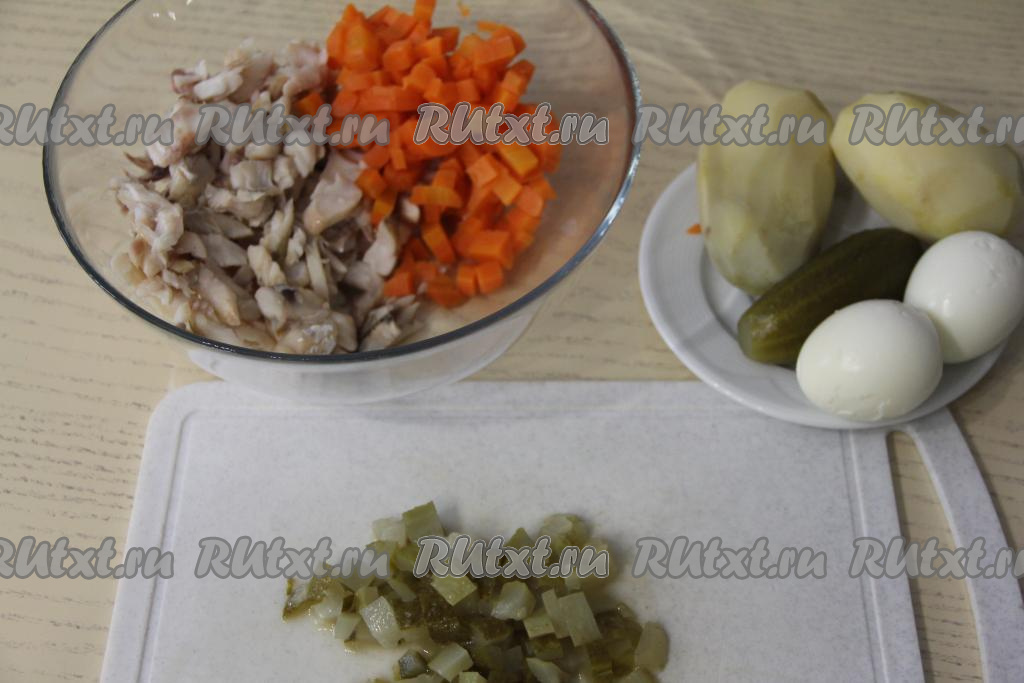 Картошку и морковь почистить. Морковь нарезать на средние кубики. Филе минтая и нарезанную морковку выложить в салатник. Маринованные огурцы нарезать на средние кубики.