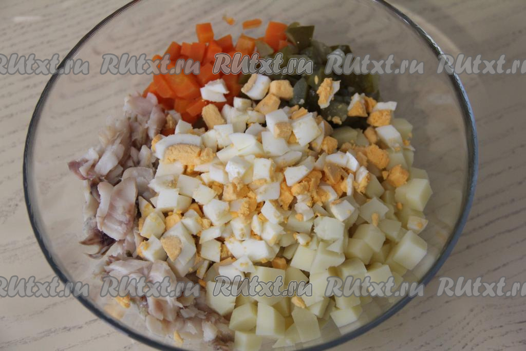 Очищенные яйца и картошку тоже нарезать на средние кубики. Нарезанные огурцы, картошку и яйца добавить в салатник с отваренными минтаем и морковкой, посолить салат по вкусу.