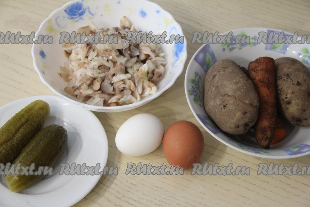 Заранее отварить картошку и морковь в кожуре до готовности (на отваривание картофеля потребуется минут 25-30 с момента закипания воды, морковки - минут 30-35, готовые овощи должны легко прокалываться ножом), после этого переложить их на тарелку, оставить остывать. Яйца отварить в течение 10 минут после начала кипения воды, а затем остудить их. Разобрать минтая на небольшие кусочки, удаляя все косточки, в результате у меня получилось 200 грамм филе рыбы.