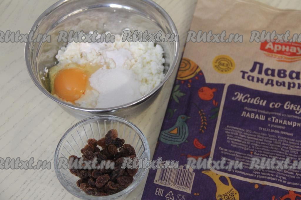 Сперва приготовим начинку. Изюм нужно заранее выложить в небольшую ёмкость, залить полностью кипятком, оставить минут на 5, после этого откинуть на сито. Как только с изюма стечёт вода, переложить его на бумажное полотенце и дать обсохнуть. В миску выложить творог, добавить сахар, ванильный сахар и сырое яйцо, растереть вилкой до получения однородной творожной массы.