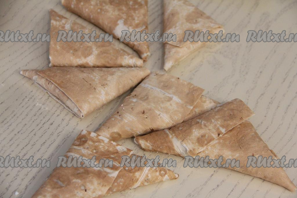 Затем продолжать сворачивать полоску лаваша в виде треугольника, формируя треугольный конвертик с творожной начинкой внутри. Аналогично сформировать все 11 конвертиков с творогом.