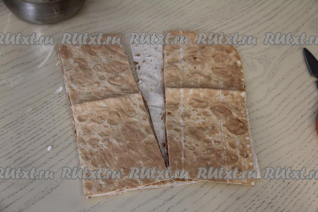 Нарезать лаваш на полоски размером 10 сантиметров на 27 сантиметров.