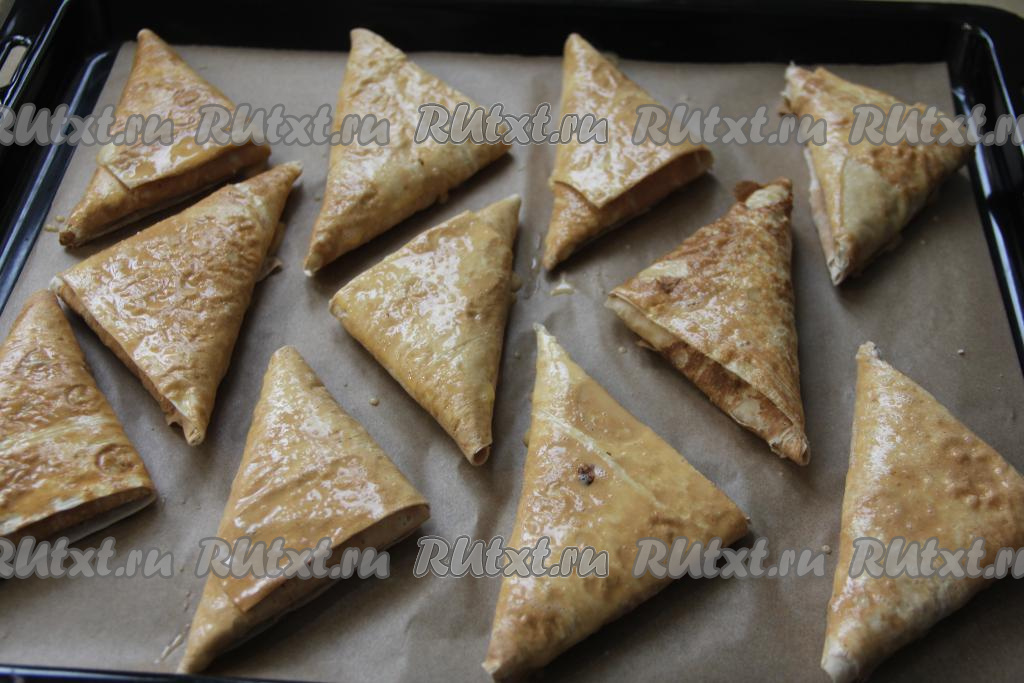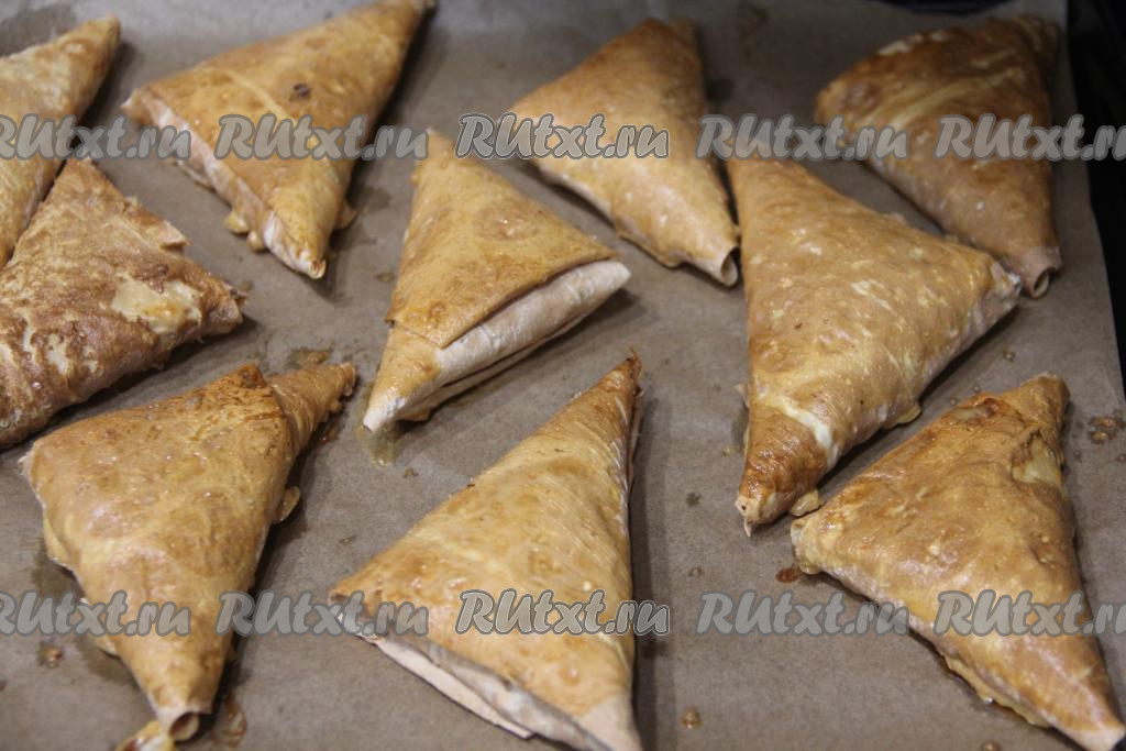 Вкуснейшие треугольники с нежной начинкой из творога достать из духовки. Эту быструю выпечку из лаваша можно подавать и в горячем, и в остывшем виде.