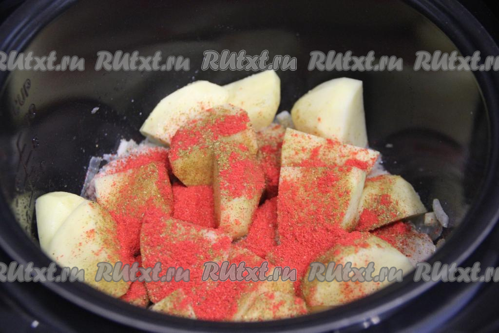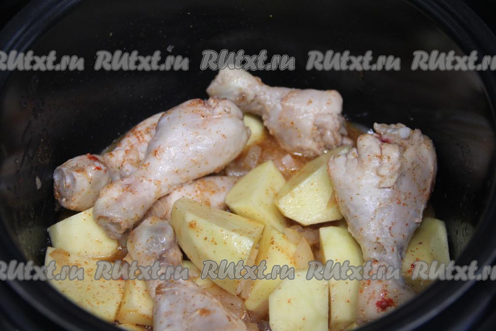Картошку нарезать на крупные дольки, добавить в чашу мультиварки к обжаренным куриным ножкам.