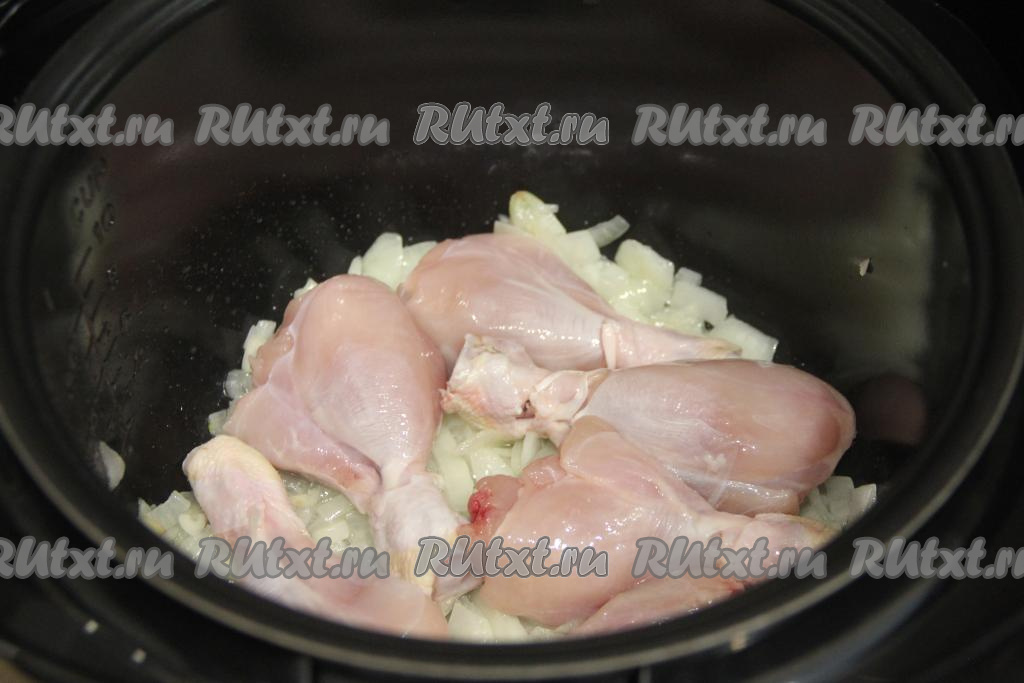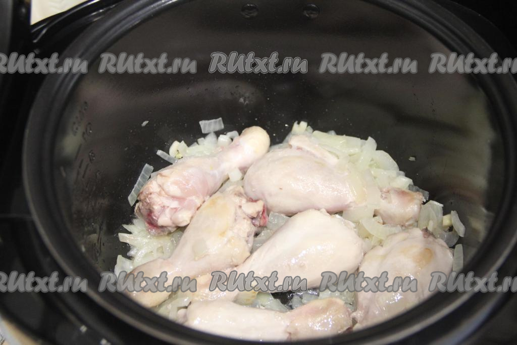 Затем выложить в чашу мультиварки куриные ножки, обжаривать их 5-7 минут.