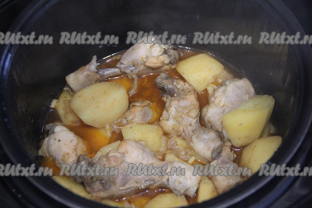 Перемешать картошку с куриными ножками, закрыть крышку мультиварки и выставить режим "Тушение" на 1 час.