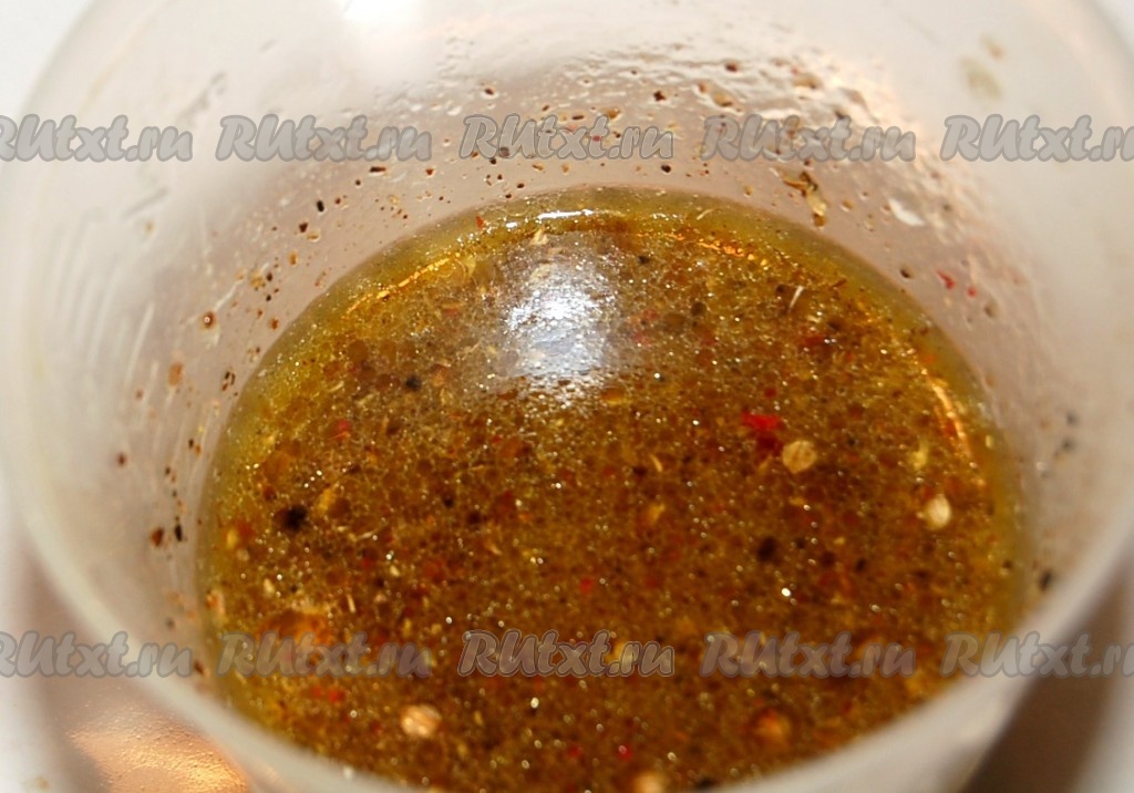 К смеси масла и лимонного сока добавить истолчённые специи, перемешать.