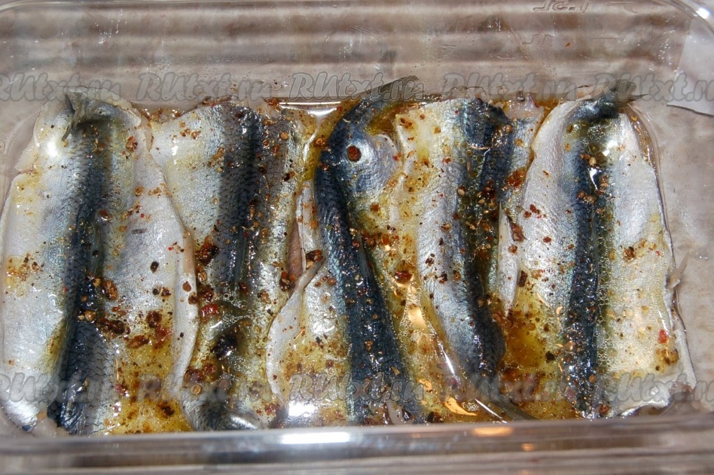 Теперь берём салаку, отряхиваем излишки соли, выкладываем рыбку в контейнер (лучше в один слой) и заливаем смесью лимонного сока, масла и специй. Контейнер с рыбкой накрываем крышкой и отправляем в холодильник на 6 часов (а лучше на ночь).