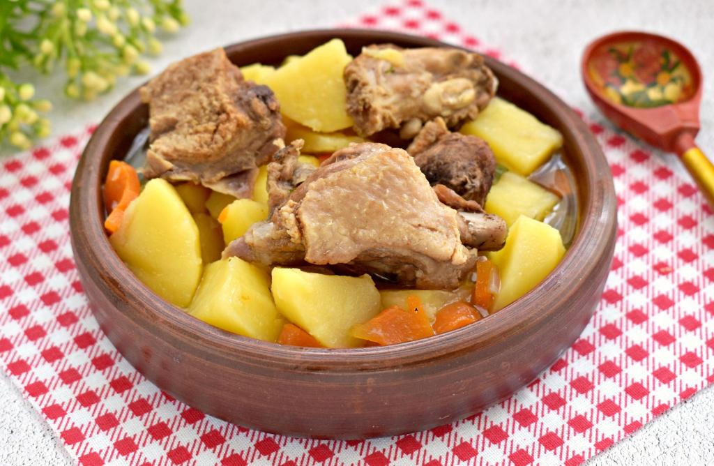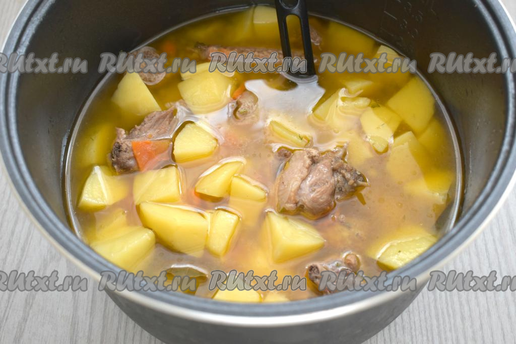 Закрываем мультиварку крышкой, выставляем режим "Тушение" на 1 час. Через час проверяем готовность блюда по картошке. Картофель должен стать достаточно мягким, легко прокалываться ножом. Если картошка твердовата, время приготовления на режиме "Тушение" можно увеличить ещё на 10-15 минут.