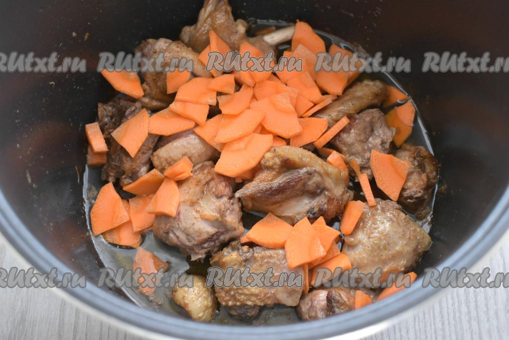 По прошествии 15 минут к обжаренным кусочкам утки добавляем достаточно тонко нарезанную морковь (я нарезала на четверть кружочки, можно нарезать на полукружочки).