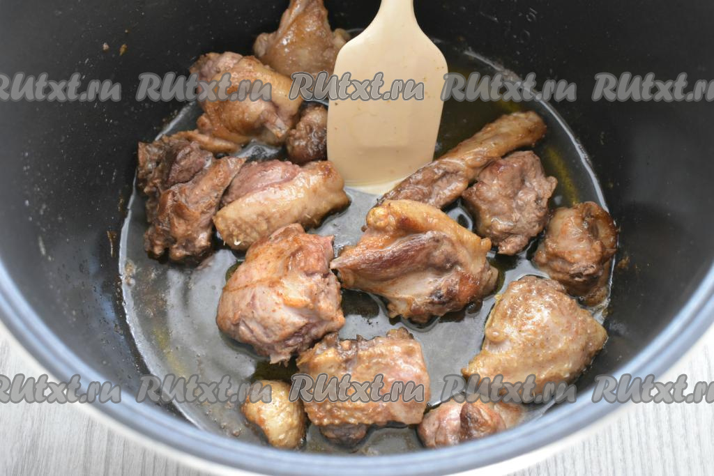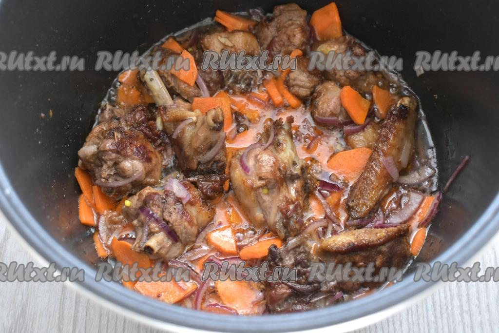 Спустя 15 минут в съёмную чашу мультиварки вливаем растительное масло. Включаем режим "Жарка" на 15 минут. Как только масло прогреется и прозвучит звуковой сигнал, выкладываем в чашу мультиварки кусочки утки. Периодически перемешивая, обжариваем мясо 15 минут.
