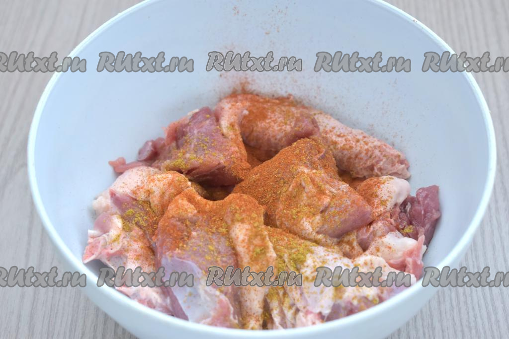 Утку, нарезанную на небольшие кусочки, моем, обсушиваем, солим, приправляем специями (в качестве специй я добавила паприку и хмели-сунели), перемешиваем. Оставляем кусочки утки полежать при комнатной температуре минут на 15, чтобы мясо пропиталось специями. Лук и морковь очищаем.
