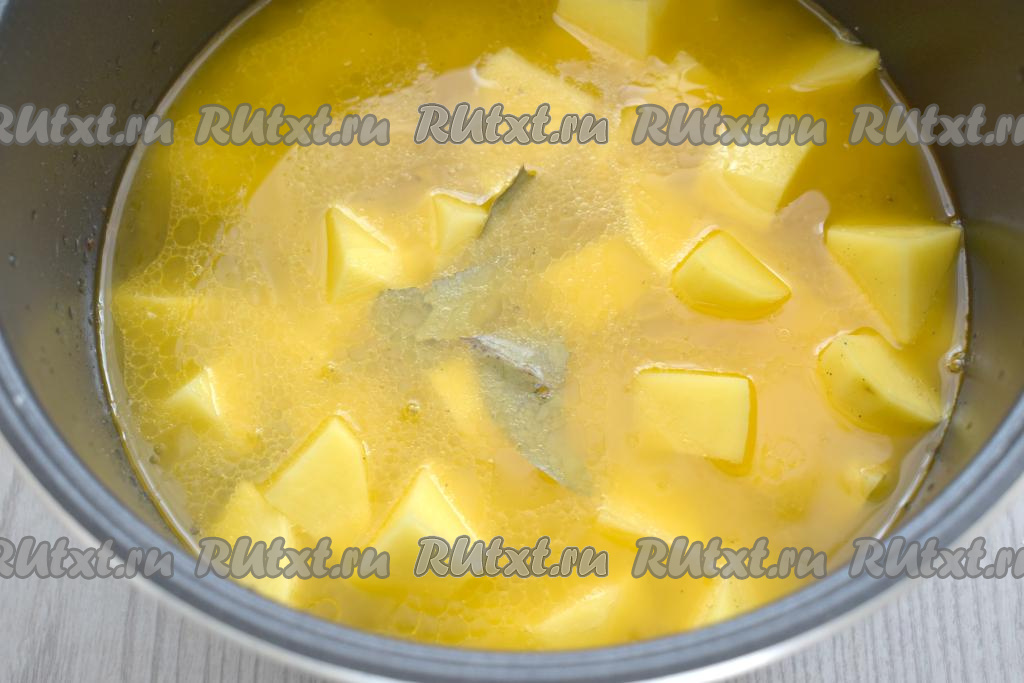 Картофель очищаем, нарезаем на средние кубики, выкладываем в чашу мультиварки, добавляем лавровый лист, по вкусу солим, приправляем специями (я всыпала чёрный молотый перец).