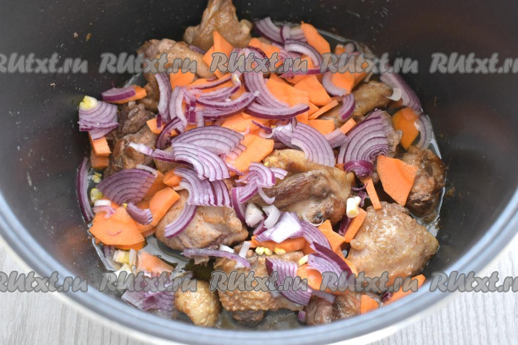 Сразу же выкладываем достаточно тонко нарезанный лук (я нарезала лук на четверть кольца). Включаем мультиварку на режим "Жарка" ещё на 5 минут.